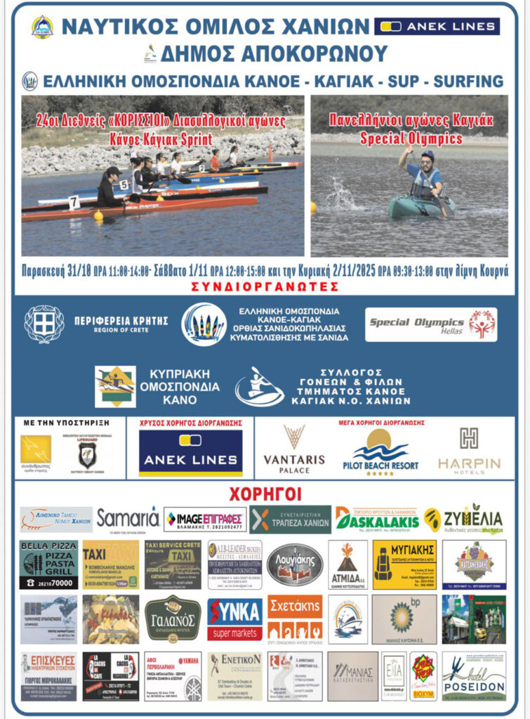 Πιστός στην παράδοση, ο Ναυτικός Ομιλος Χανίων διοργανώνει αυτό το Σαββατοκύριακο (1-2 Νοεμβρίου) τους 24ους Κορίσσιους Διεθνείς Διασυλλογικούς Αγώνες Κανόε Καγιάκ και τους Πανελλήνιους Αγώνες Καγιάκ Special Olympics. Μια διοργάνωση που έχει πλέον καθιερωθεί ως θεσμός, συγκεντρώνοντας αθλητές, προπονητές και συλλόγους από Ελλάδα και Κύπρο.